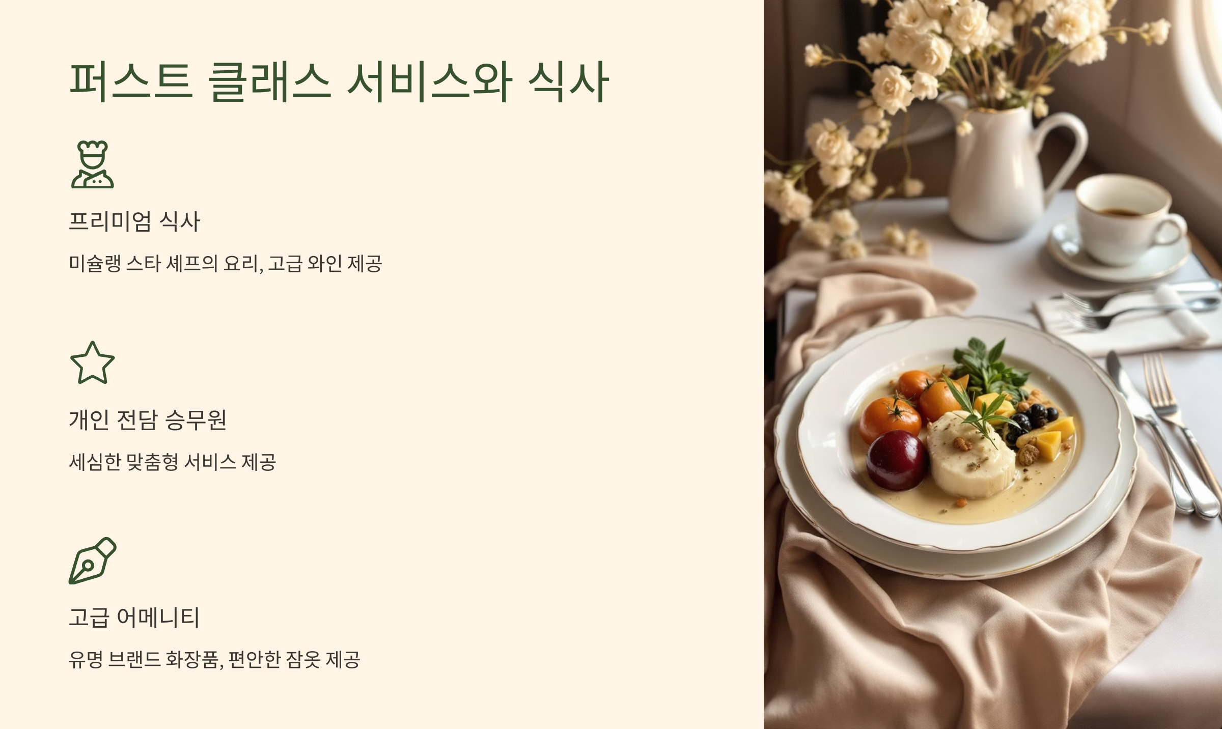 퍼스트 클래스에서는 각종 맞춤형 서비스와 미식 경험을 즐길 수 있습니다.