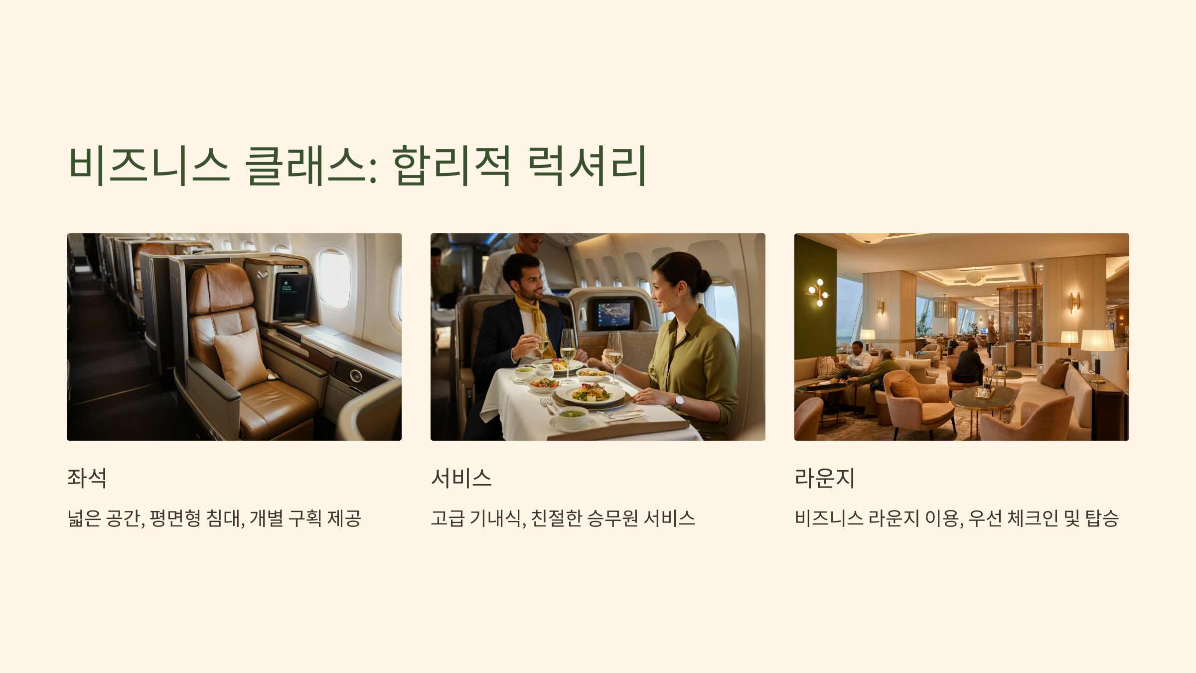 💡 비즈니스 클래스는 합리적인 비용으로 럭셔리한 경험을 원할 때 좋은 선택입니다.