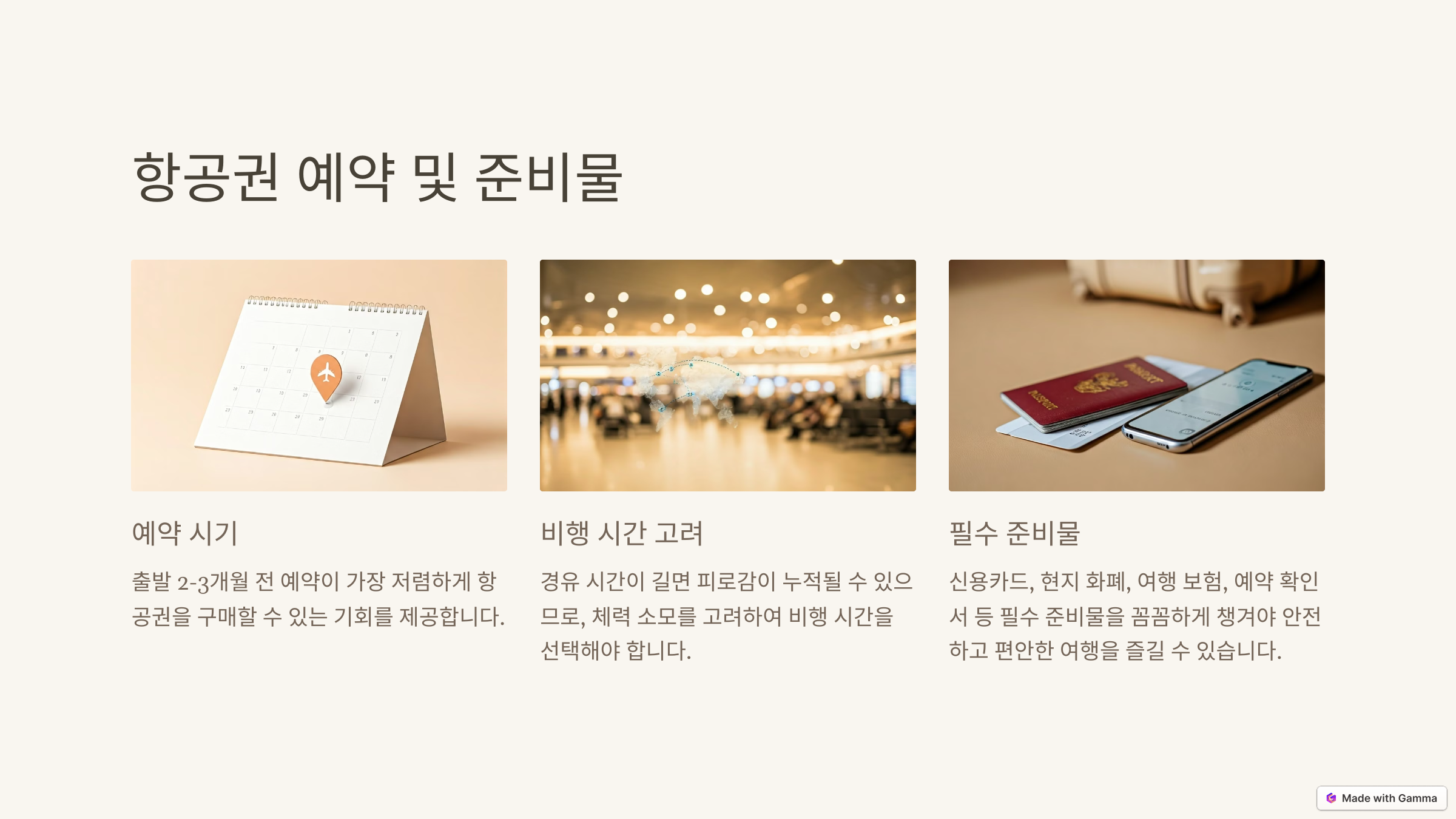- 항공권 예약 타이밍: 일반적으로 출발일로부터 2-3개월 전에 예약하면 가장 저렴한 항공권을 구할 수 있습니다. 가격 비교 사이트(스카이스캐너, 카약 등)를 이용하여 최적의 항공권을 찾아보세요.