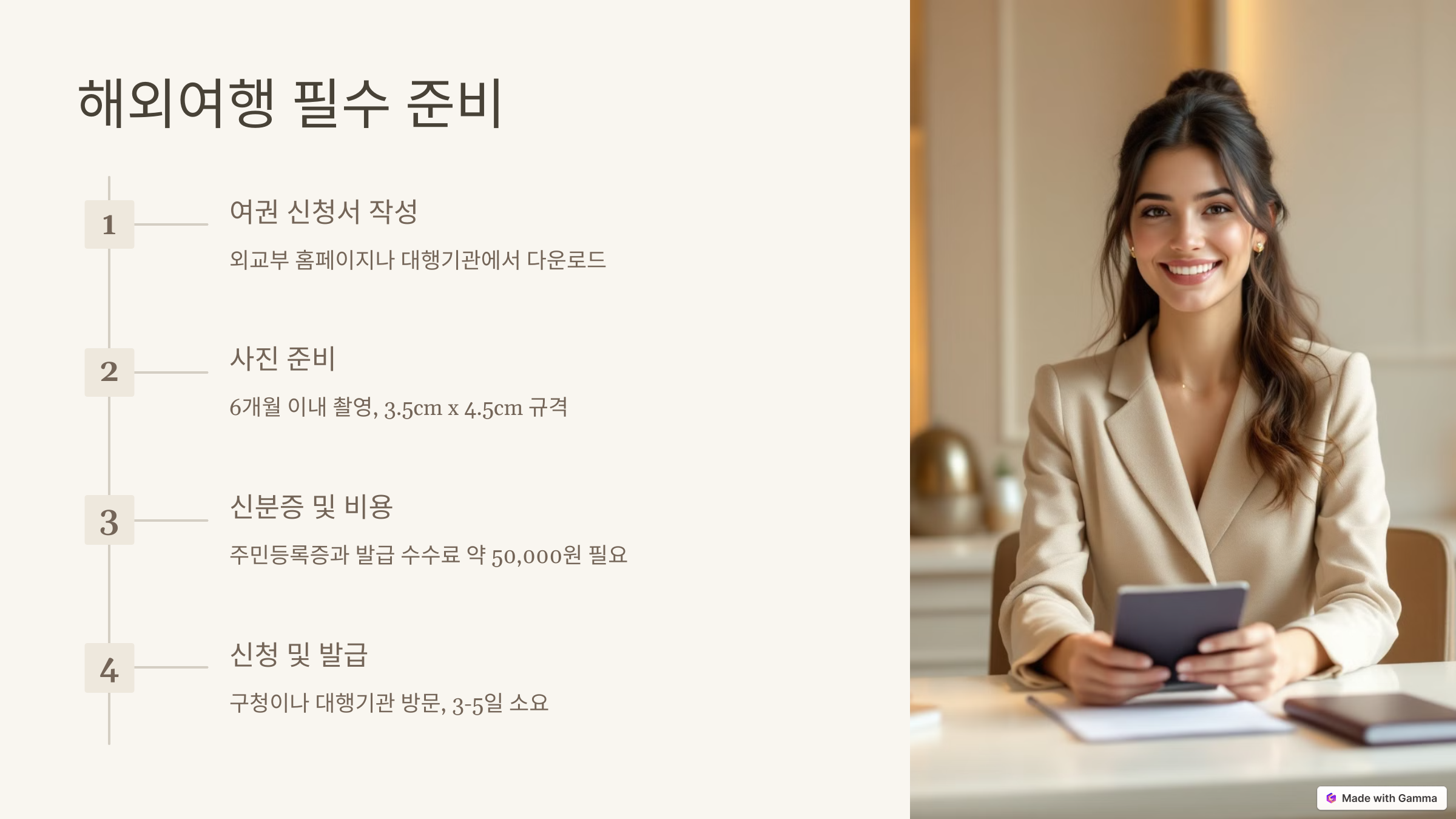 - 신청서 제출 및 발급 기간: 관할 구청이나 여권 사무 대행기관에 직접 방문하여 신청합니다. 발급까지는 보통 3-5일 정도 소요되므로 출발 날짜에 맞춰 미리 준비해야 합니다.