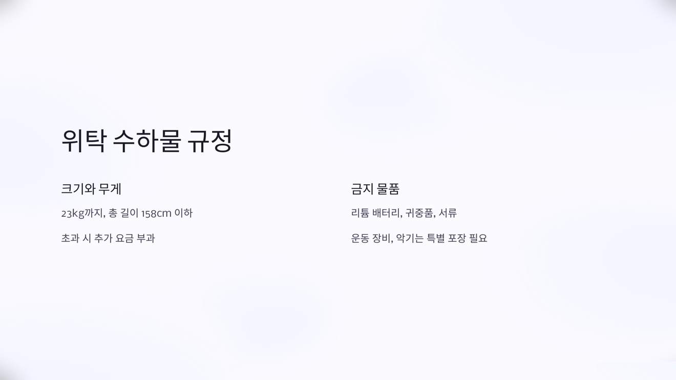 - 특별 케이스: 일부 항공사는 운동 장비나 악기를 위탁 수하물로 허용하며, 별도의 보호 패키지를 사용해 안전하게 포장해야 합니다.