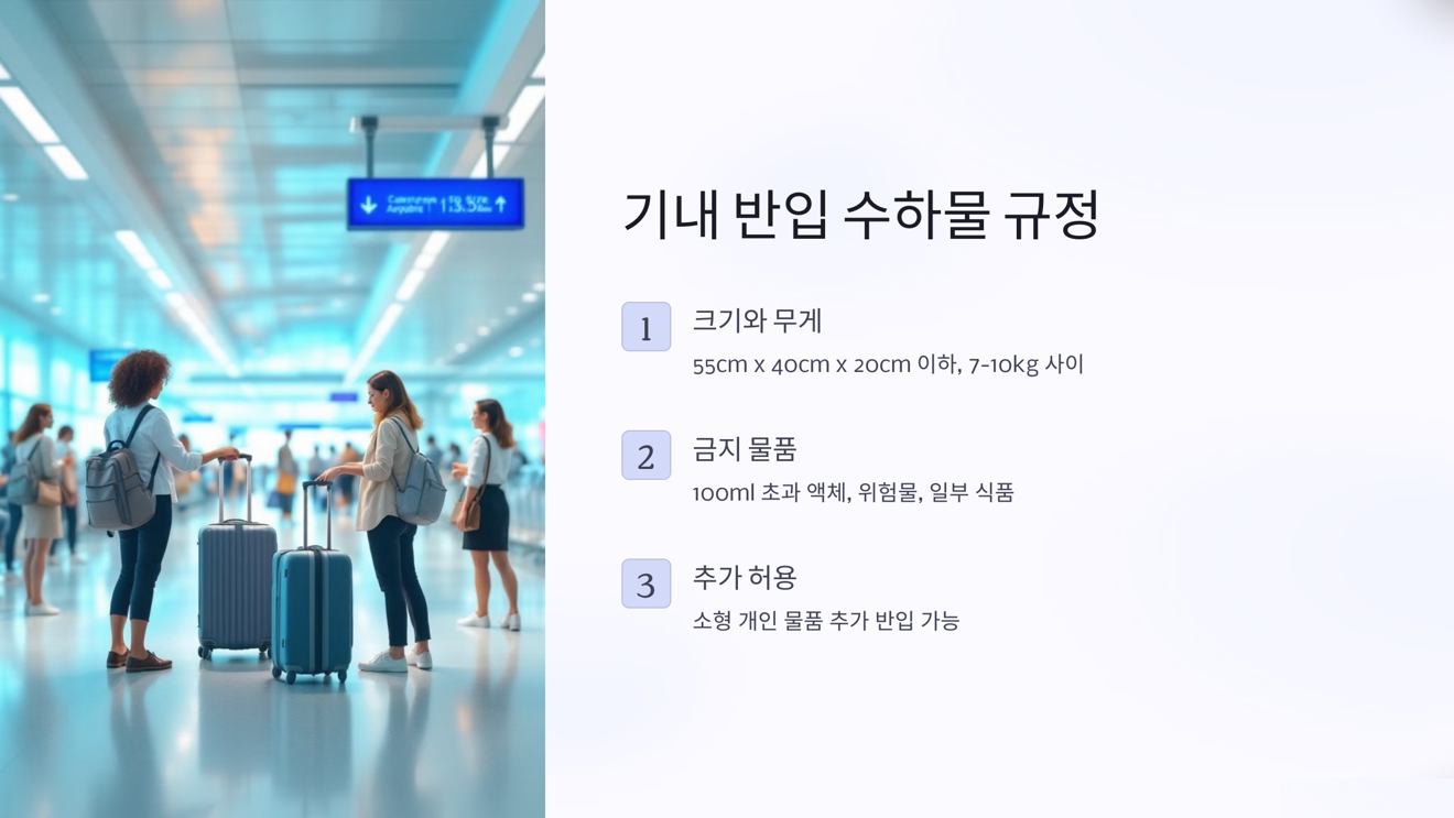 - 참고: 기내 반입 가능한 가방 외에도 소형 개인 물품(예: 노트북, 핸드백)을 추가로 들고 탈 수 있습니다.