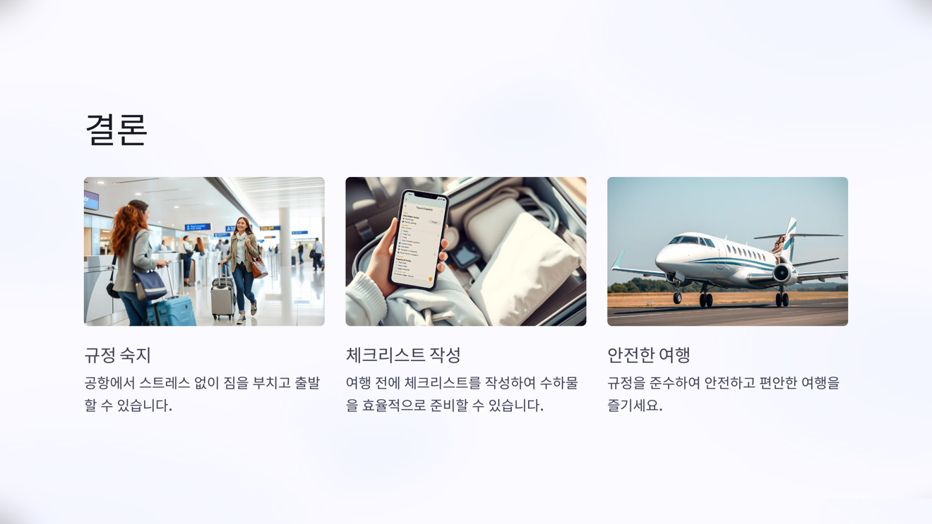 비행기 수하물 규정을 미리 숙지하면 공항에서의 스트레스가 훨씬 줄어듭니다. 여행지의 규정에 맞추어 수하물을 준비하고, 항공사와 국가별 수하물 규정도 꼼꼼히 확인하세요. 여행 전 수하물 체크리스트를 작성해보는 것도 좋은 방법입니다. 안전하고 편안한 여행을 위해 수하물 규정을 지켜 짐을 효율적으로 준비해 보세요.🧳