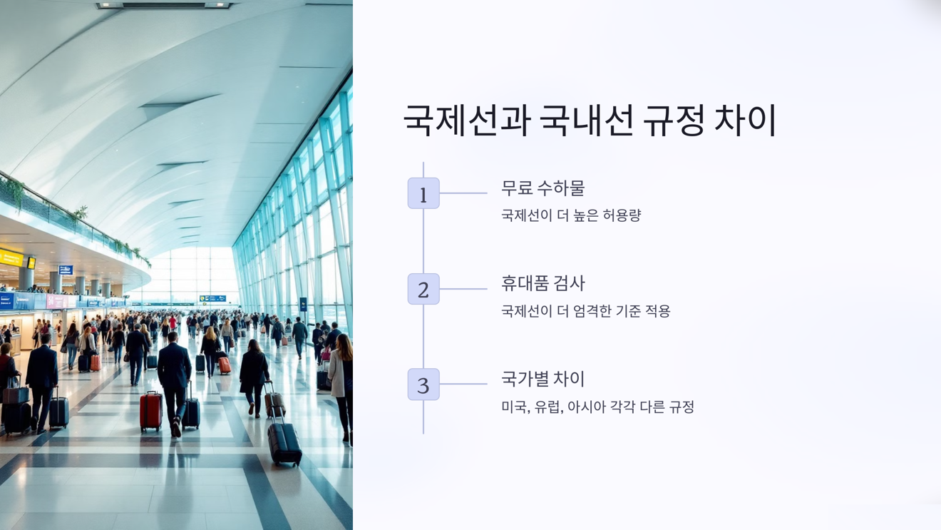 - 휴대품 검사 기준: 액체류와 음식물 반입 규정은 국제선이 더 엄격하므로 국제선을 이용할 때는 기내 반입 물품 검사에 주의해야 합니다.